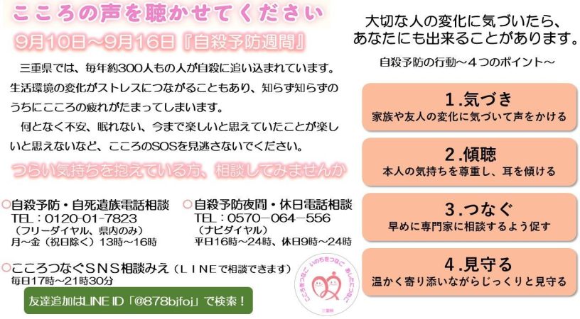 こころの声を聴かせてください / こころの声を 聴かせてください \ 『自殺予防週間』 9月10日~9月16日 生活環境の変化により こころの疲れがたまっていませんか 不安、眠れない、つらい、逃げたい と思ったらの合図です 一人で悩まずご相談ください 相談窓口は県HPより https://www.pref.mie.lg.jp/KOKOROC/KOKORO/kokoro00006.htm 三重県では奨学金返還額の一部を助成します前の記事 フレンテみえ「男女共同参画フォーラム」次の記事