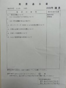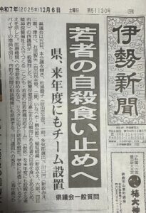 12月5日、一般質問をさせて頂きました 2025.12.16 12月5日、一般質問をさせて頂きました 1.防災対策について (1) みえ防災ナビの活用について (2) 防災意識の向上に向けて 2.オーバードーズ(OD)による自殺対策について 3.若者に必要なSNS対策について 4.若者への性教育について 5.みえの歴史街道の活用について https://youtu.be/Rmo83tTFCgw 質問をさせて頂きました。 FC VALOR杯サッカー大会前の記事